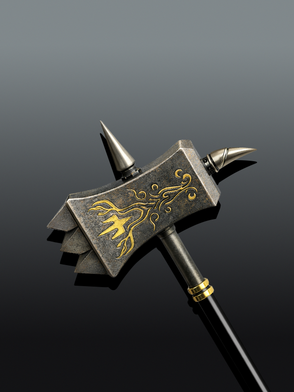- Our replica resembles the show’s Warhammer prop. The head is impressive cast metal with an antique finish and gold-painted inlay. It is 14.5 inches long. The hilt is beautiful, soft steel with genuine leather wrap. Inline are 24k gold-plated accent rings.
